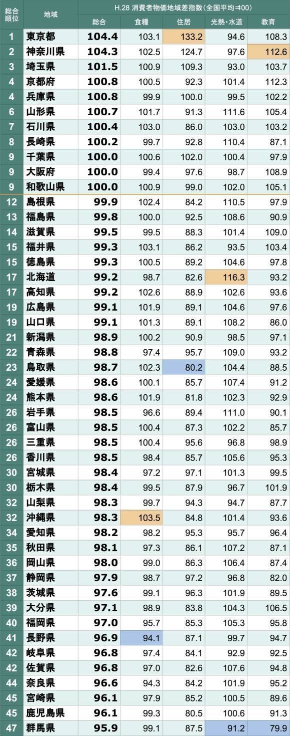 日本物価が高い都道府県ランキング